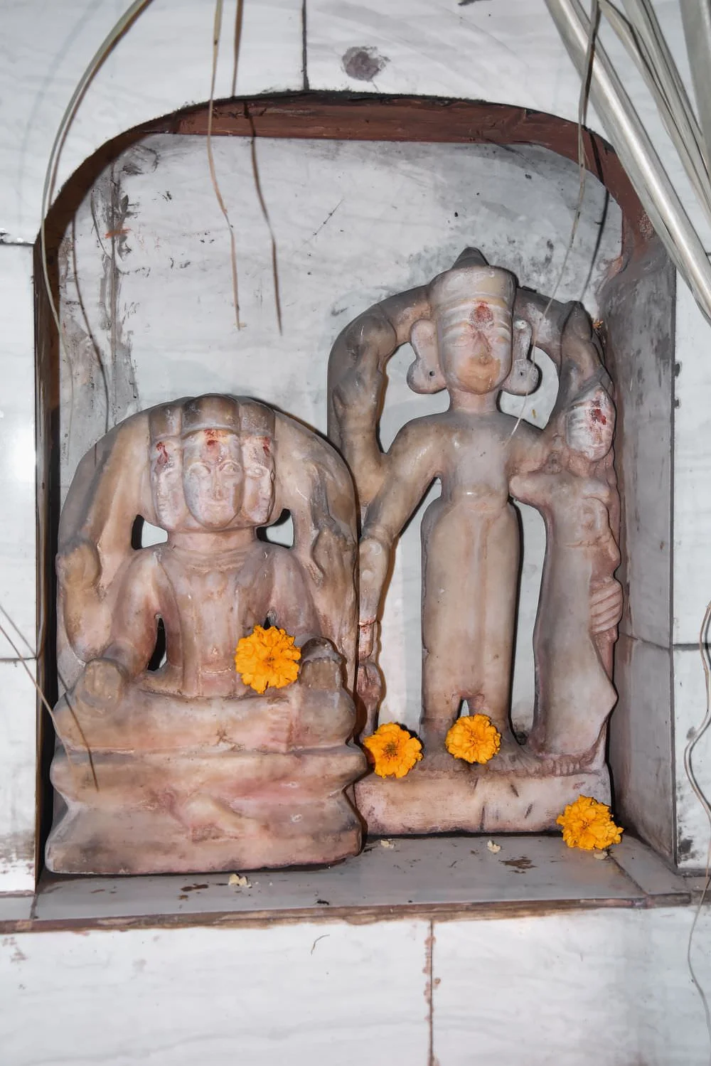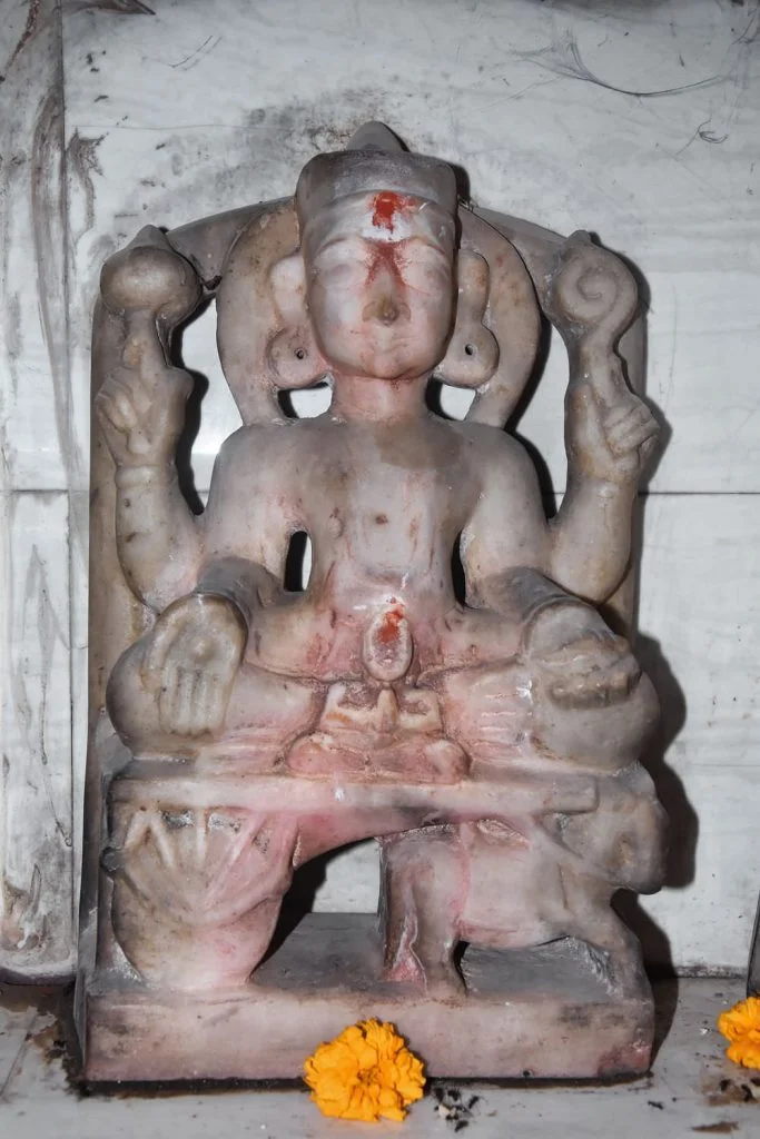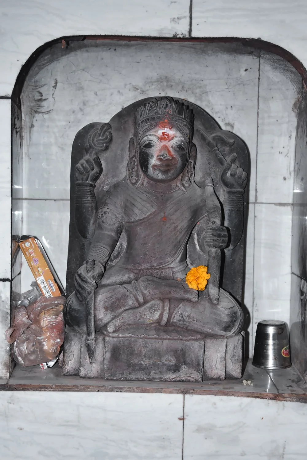 A sculpture of a goddess is placed in one of the niches. The four-armed goddess is shown seated, holding a dhanush (bow) and baan (arrow) in her lower hands, ankush (goad) and an unidentified object in her upper hands. She is wearing a mukuta, earrings, necklace, armbands, bangles and anklets. Two more marble sculptures are found in the garbhagriha. Both the sculptures are mutilated.